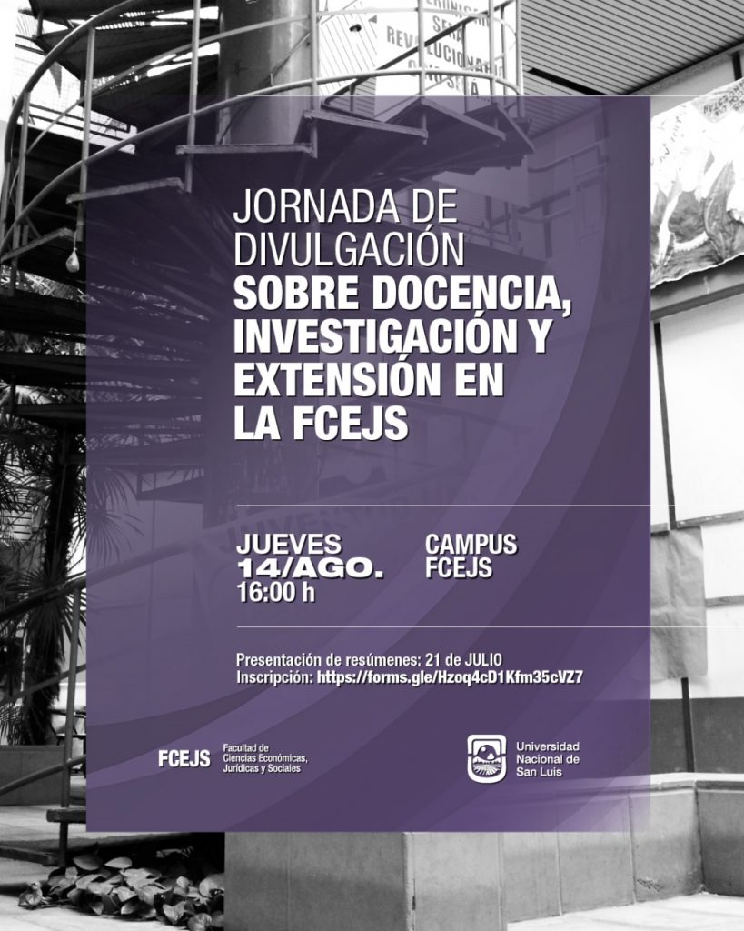 Se invita a toda la comunidad universitaria a participar de esta jornada, que es organizada de manera conjunta por la Secretaría Académica, la Secretaría de Extensión Universitaria y la Secretaría de Investigación y Posgrado de la Facultad de Ciencias Económicas, Jurídicas y Sociales, junto con el Instituto Escuela de Economía, Negocios y Transferencia Tecnológica.