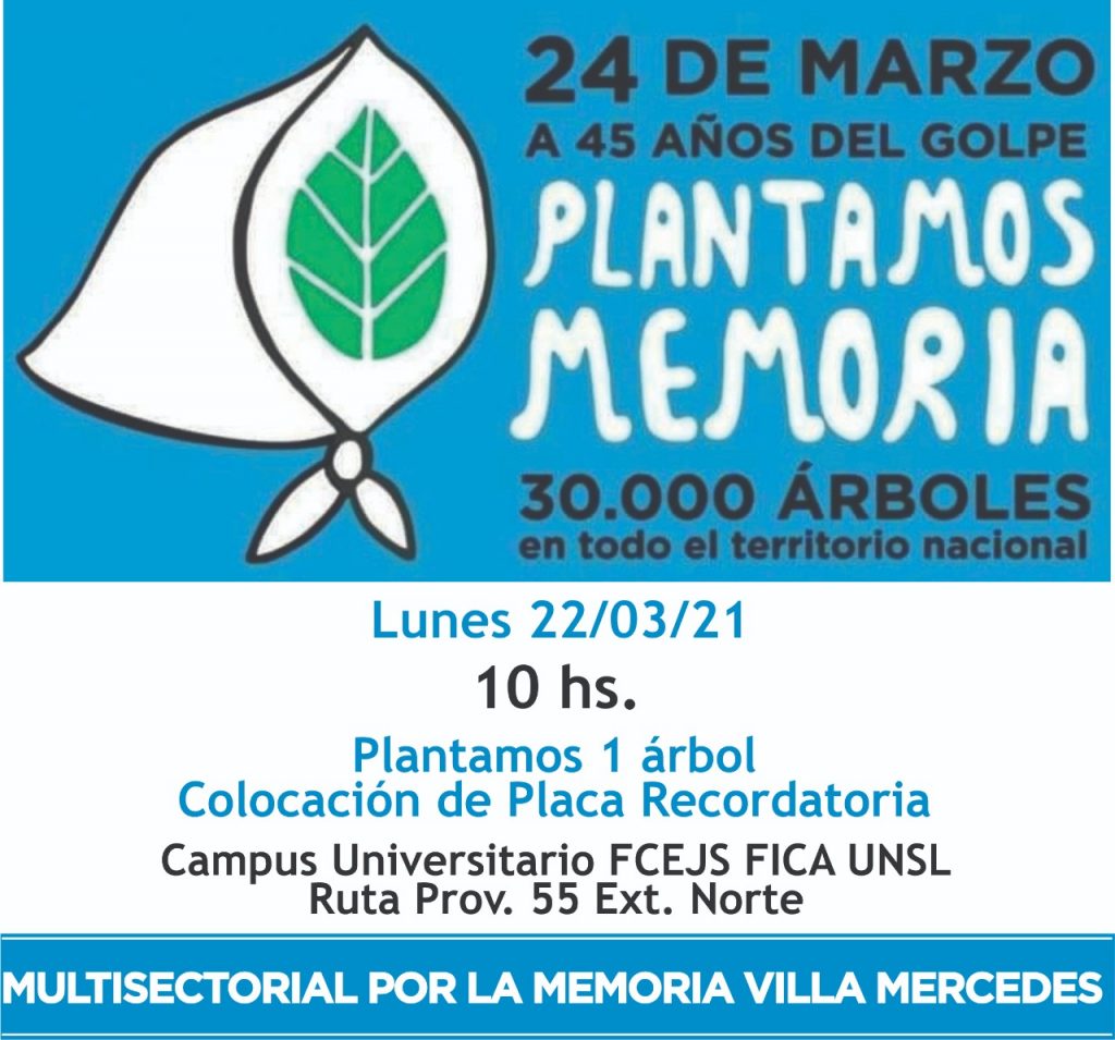 El próximo lunes 22 de marzo de 2021 a las 10 h, en el Campus Universitario de la UNSL en Villa Mercedes, se procederá a plantar un árbol junto a la colocación de una placa conmemoratoria en el marco de las actividades “Plantamos Memoria, 30.000 árboles en todo el territorio nacional”, organizada por la Multisectorial por La Memoria Villa Mercedes.