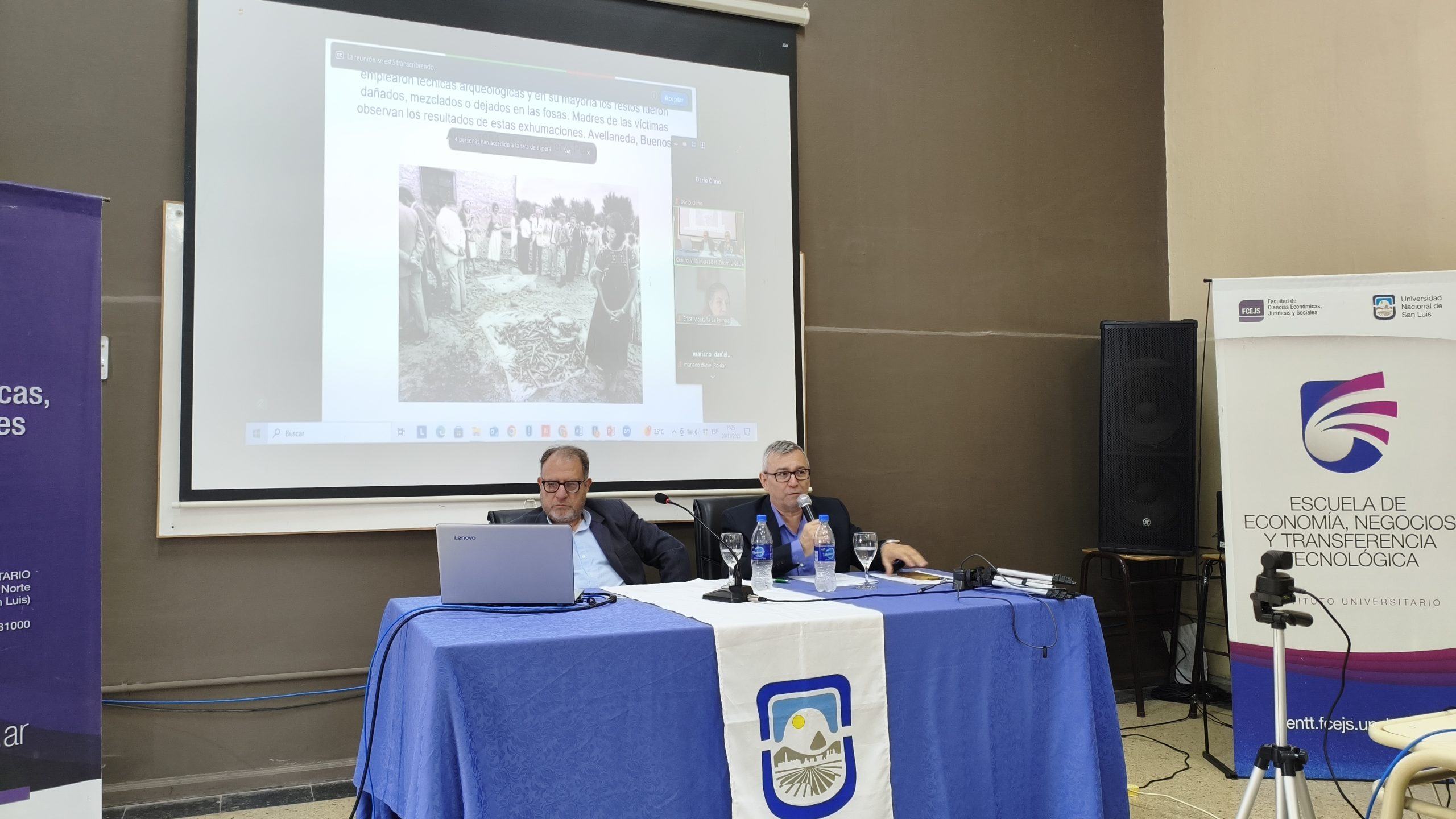 El encuentro fue moderado por la Lic. Mónica Beatriz Guaycochea, profesora responsable de las asignaturas Sociología, Sociología de la Salud y Teorías Sociales del Delito y la Inseguridad. Fue organizado por el PROICO N.° 15-2123 “Prácticas y saberes en el campo de la economía social y solidaria: experiencias en entramados productivos en localidades de la provincia de San Luis”, el PROICO “Políticas de desarrollo en la provincia de San Luis. El discurso de la época en su subjetividad y el lazo social”, la cátedra de Antropología Social y Cultural, Estructura Social Argentina, Sociología, Sociología de la Salud y Teorías Sociales del Delito y la Inseguridad. Profesor responsable: Esp. Esteban Gabriel Arias y equipo docente. Profesora responsable: Lic. Mónica Beatriz Guaycochea y equipo docente.
