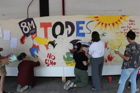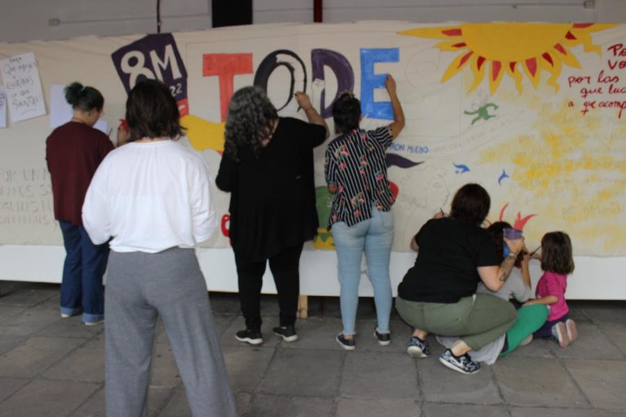 La Secretaria de Extensión Universitaria, Lic. Elizabeth del Valle Magallanes expresó que, en la tarde del miércoles 9 de marzo, tuvo lugar en el buffet de la planta baja la actividad de cierre de la jornada, donde se llevó a cabo la pintura de la pancarta conmemorativa, un “trabajo de construcción colectiva” en la que participaron integrantes del programa del Programa Género, Sociedad y Universidad; del ciclo Decires, Sentires y Vivires de la Biblioteca Antonio Esteban Agüero, y estudiantes de la Licenciatura en Trabajo Social y la Tecnicatura Universitaria en Acompañamiento Terapéutico, entre otros. Esta actividad estuvo a cargo de la educadora y artista comunitaria, Claudia Ferreyra con la intervención de las lecturas de Lucero Gómez Cruz, Sara Barros, Fernanda Soru, Sonia Álvarez y Tata Evangelista; y número musical del grupo “Las Violetas”. El encuentro contó con una mesa informativa, brindada por la Secretaría de Estado de la Mujer, Diversidad e Igualdad del gobierno de San Luis.