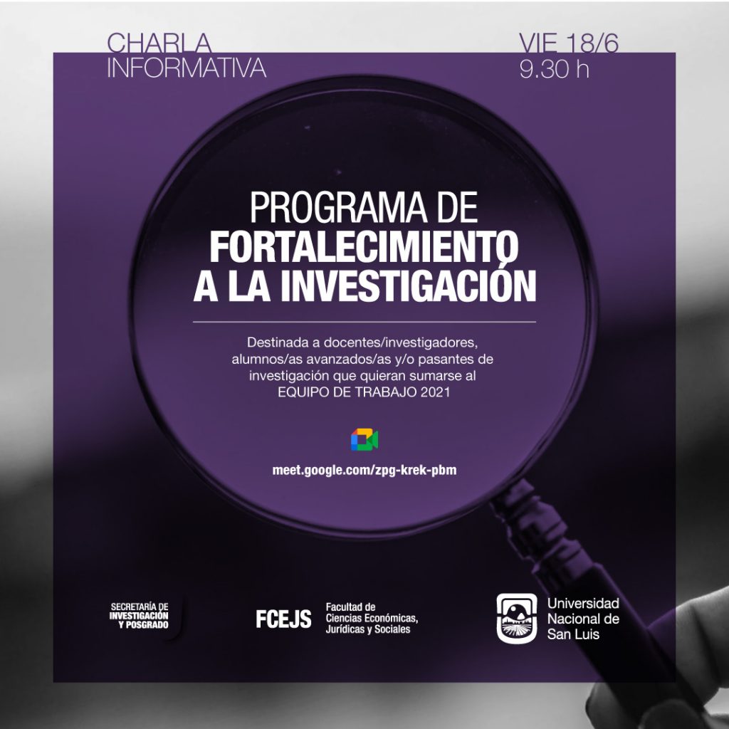 La Secretaría de Investigación y Posgrado invita a docentes, investigadores, pasantes y /o integrantes de proyectos de investigación a una reunión informativa a los efectos de conformar los equipos de trabajo para el año 2021 del Programa de Fortalecimiento a las Prácticas de Investigación.