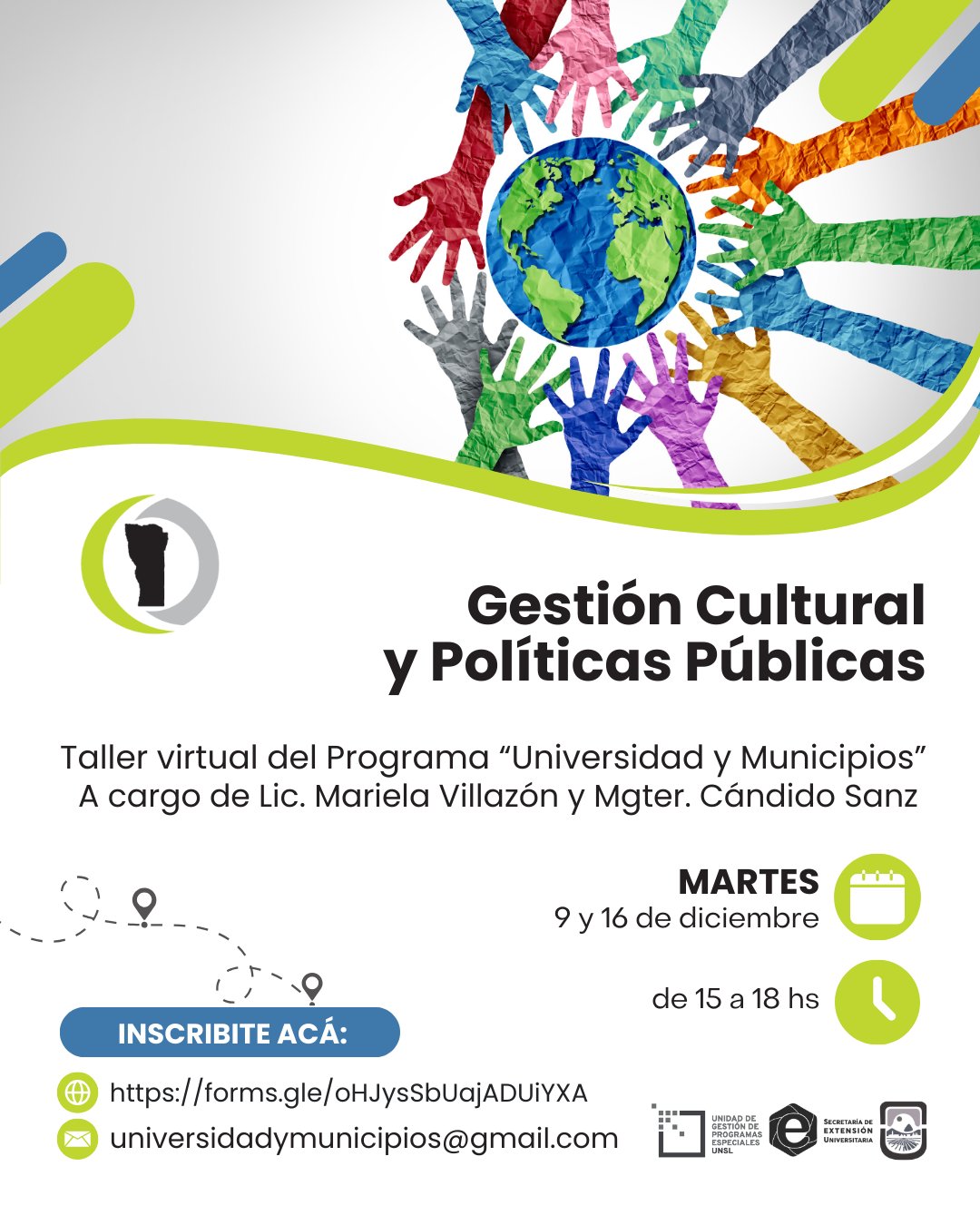 El taller se dictará los días 9 y 16 de diciembre, de 15:00 a 18:00 horas, a través de la plataforma Zoom. Esta propuesta invita a repensar la gestión cultural desde los derechos culturales, la participación comunitaria y la planificación estratégica, recuperando la dimensión política y territorial que atraviesa todo proceso cultural.