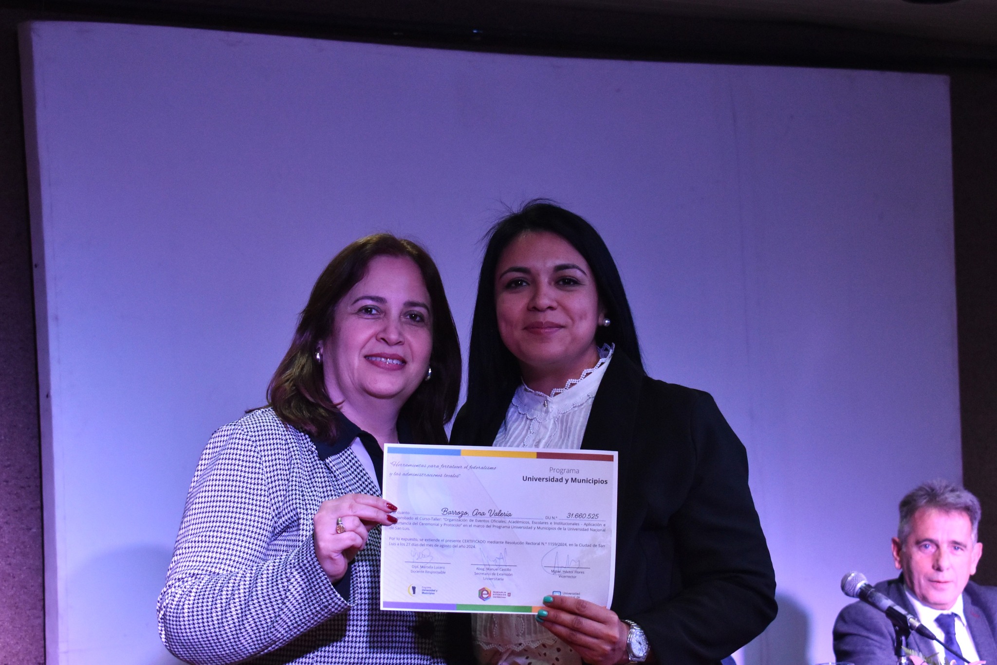 La entrega de certificados estuvo encabezada por el Vicerrector de la UNSL, Héctor Flores, quien destacó la importancia del curso como un reflejo del compromiso de la universidad con los Municipios, ya que la capacitación en esta temática fue demandada por muchos de ellos. Acompañaron al Vicerrector el Secretario de Extensión Universitaria, Manuel Castillo, y la Directora de Relaciones Públicas, Ceremonial y Protocolo (y coordinadora académica del curso), Marcela Lucero, quienes también ofrecieron palabras de reconocimiento a los egresados.