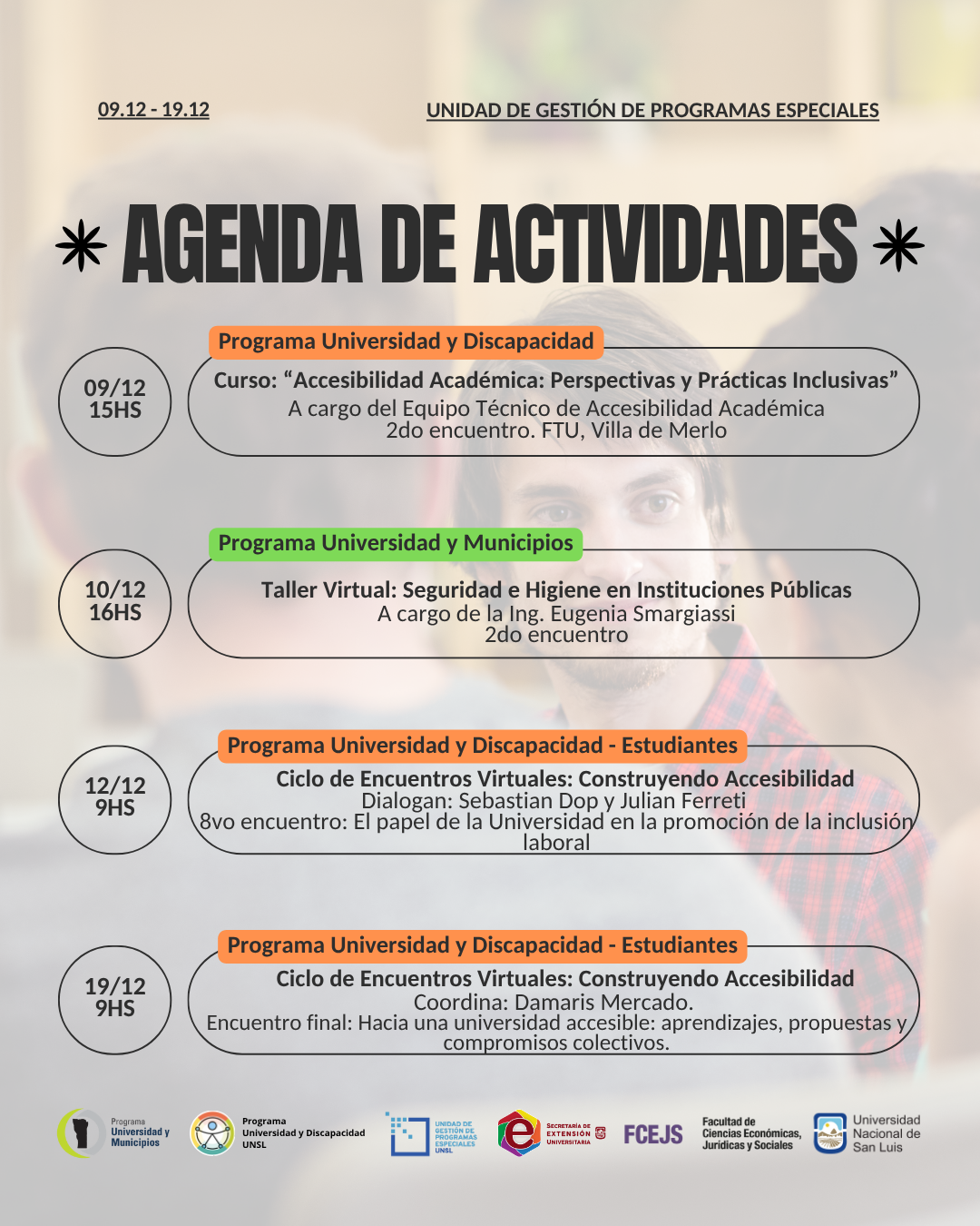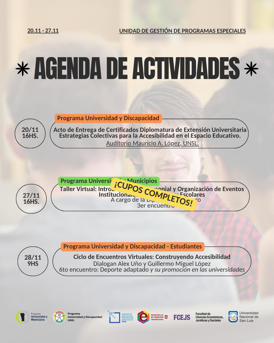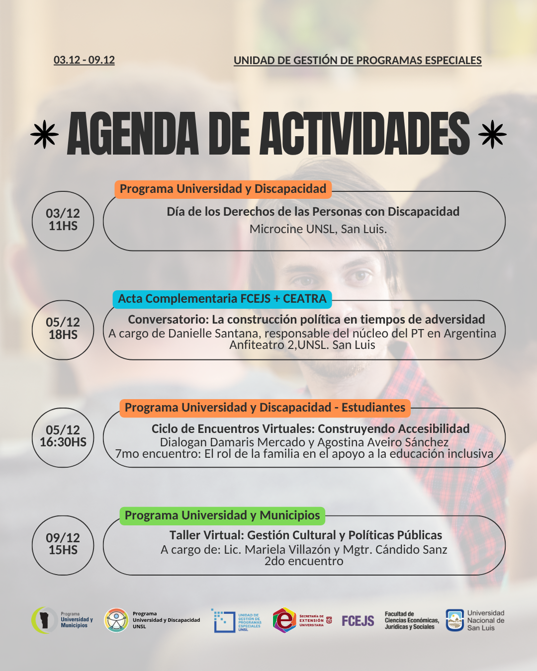 La agenda reúne iniciativas impulsadas desde los programas Universidad y Discapacidad y Universidad y Municipios (ambos de carácter rectoral y con gestión operativa desde la UGPE), además de acciones vinculadas a convenios, actas complementarias y otras actividades articuladas con distintas áreas de la FCEJS, UNSL e instituciones del medio.