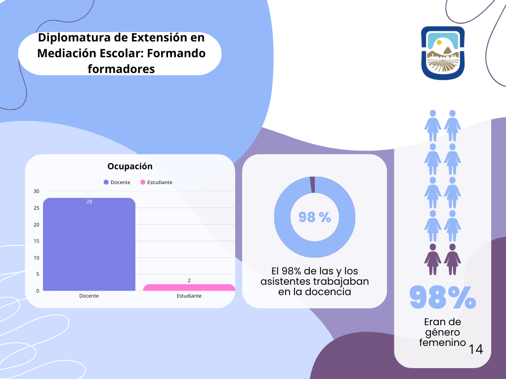 - Diplomatura de Extensión en Mediación Escolar, Formando Formadores: Dirigida a docentes, con un 98% de asistentes provenientes del ámbito educativo, promoviendo la resolución pacífica de conflictos en las instituciones. El 93.3% de los participantes fueron mujeres.