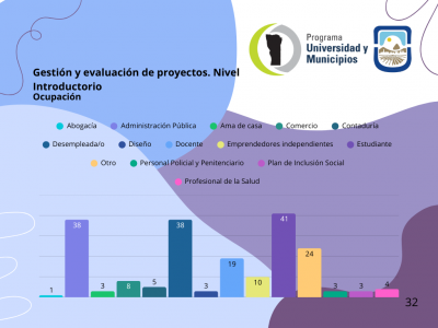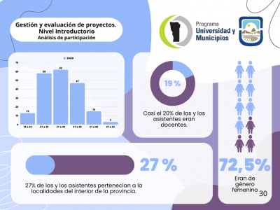 - Taller “Gestión y Evaluación de Proyectos”: Capacitación enfocada en el desarrollo de habilidades para la planificación estratégica y el análisis económico-financiero. La mayoría de los asistentes (72.5%) fueron mujeres, con una notable participación del sector docente y administrativo público.