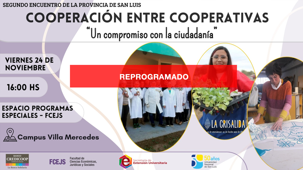 La Secretaría de Extensión Universitaria de la FCEJS, informa que ha sido reprogramado el Segundo Encuentro de la Provincia de San Luis “Cooperación entre Cooperativas. Un Compromiso con la ciudadanía”, pautado para este viernes 24 de noviembre a partir de las 16 horas en Villa Mercedes.