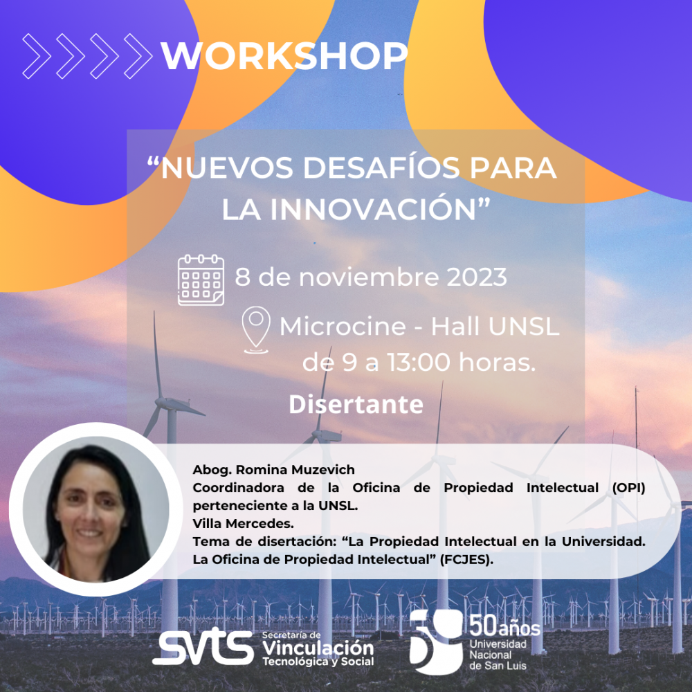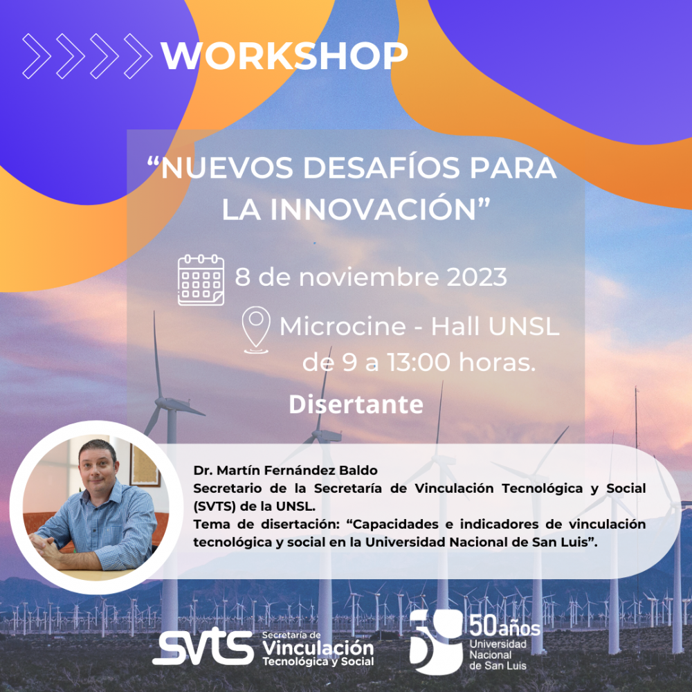 La Secretaría de Vinculación Tecnológica y Social (SVTS) UNSL invita a toda la comunidad a participar del workshop “Nuevos Desafíos para la Innovación”, que se llevará a cabo el 8 de noviembre en el Microcine de Rectorado de 9 a 13 horas.