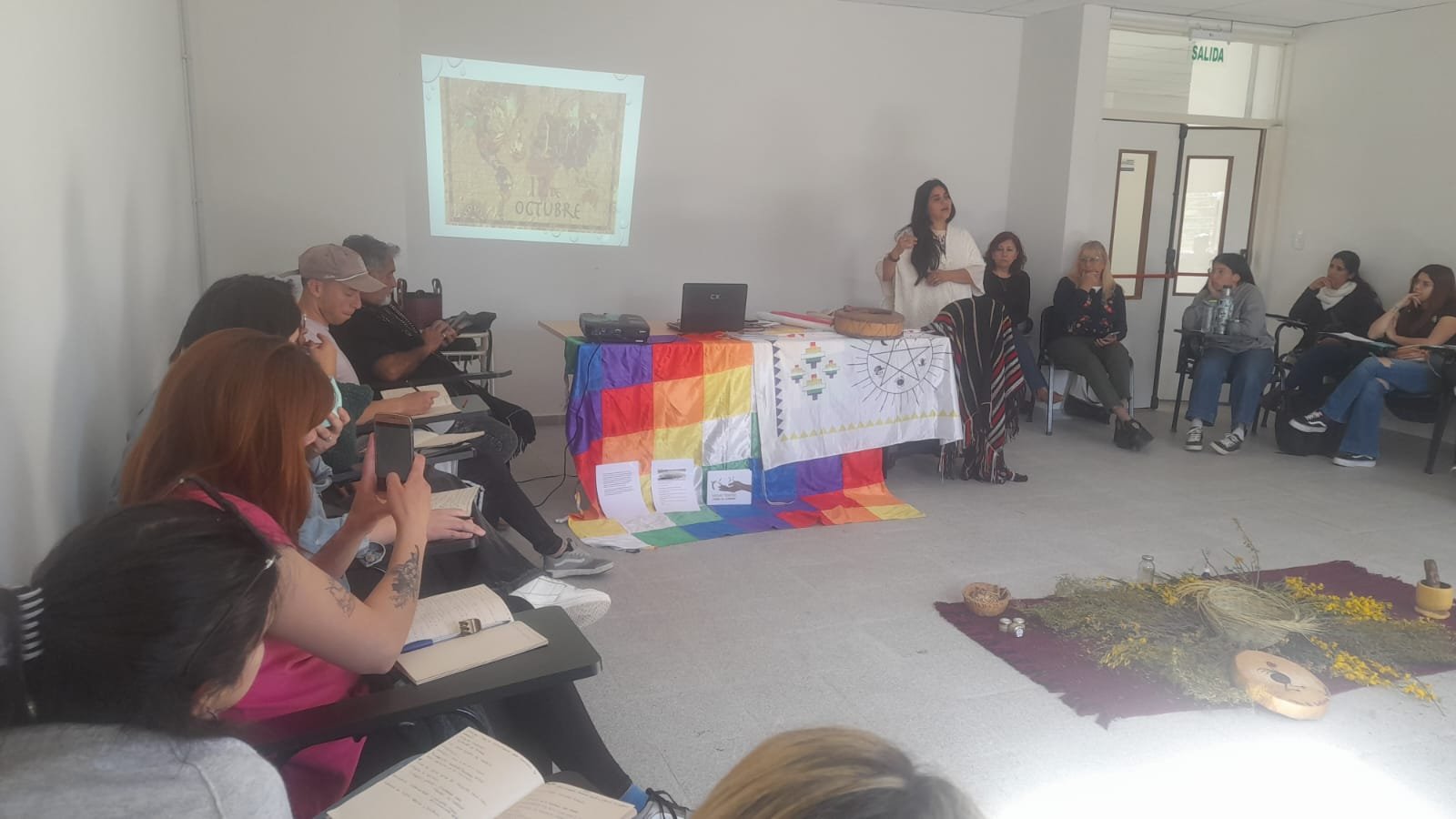 La Secretaría de Extensión Universitaria informa que durante el miércoles 11 de octubre de 2023, se llevó a cabo el Taller “Interculturalidad, educación y economía social: Diálogo de saberes en la comunidad Huarpe” a cargo de la Educadora originaria Ya Umuk.